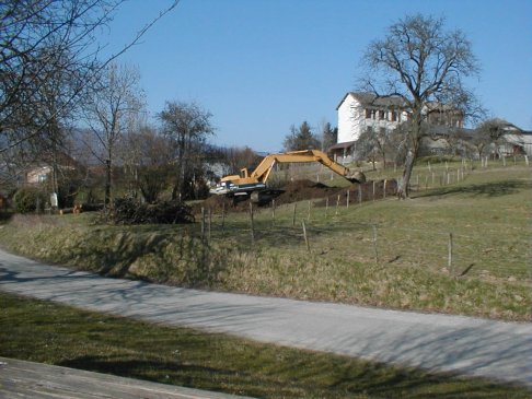 Enfin le premier coup de pelleteuse. (Nous avions pensé le faire à la pelle et à la pioche mais après un rapide calcul il aurait fallut 2 ans à un homme seul pour dégager la terre avec une brouette en travaillant 365 jours par ans -;) , il à fallut une petite semaine pour décaper la terre végétale et creuser le trou et les fondations avec la pelleteuse (C’est tout de même bien le progrès ;-).